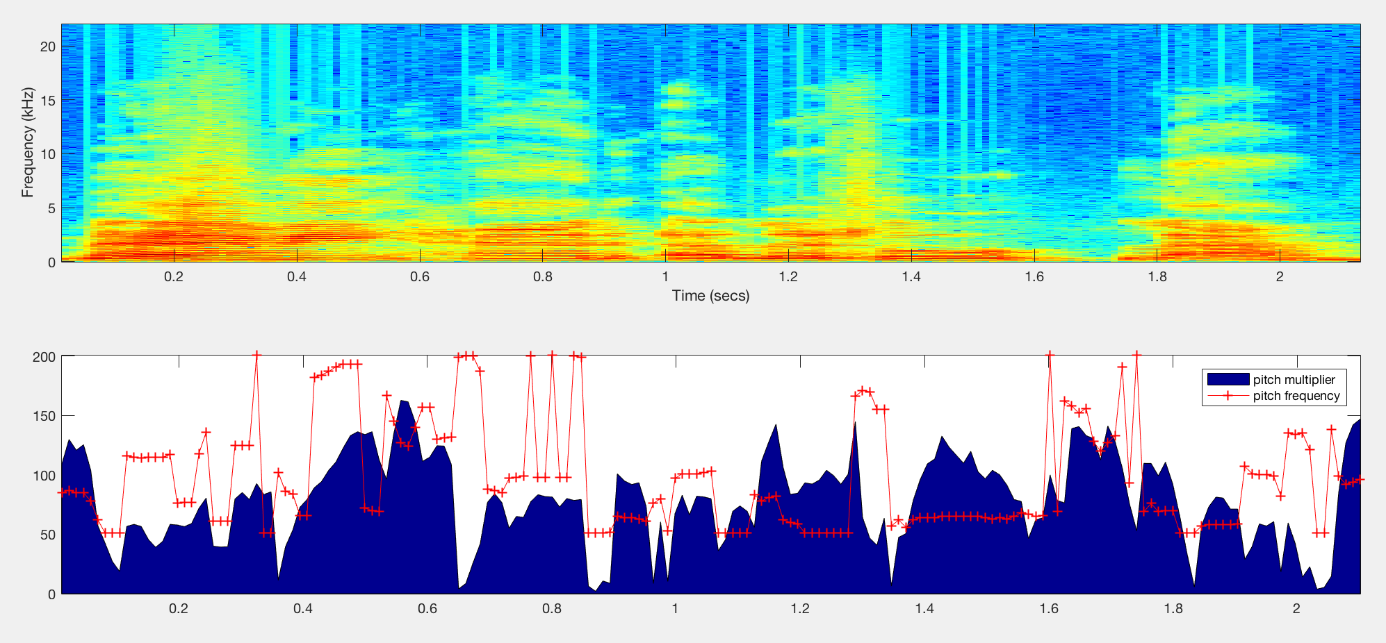 Let's combine some of these with a pitch analysis. In this case it's not possible to visualise this over such a long recording, so we need to work with just part of it, so we need to begin by selecting just the "shout" part of the recording. Next we slice the recoding into a sequence of overlapping segments and analyse these individually;
